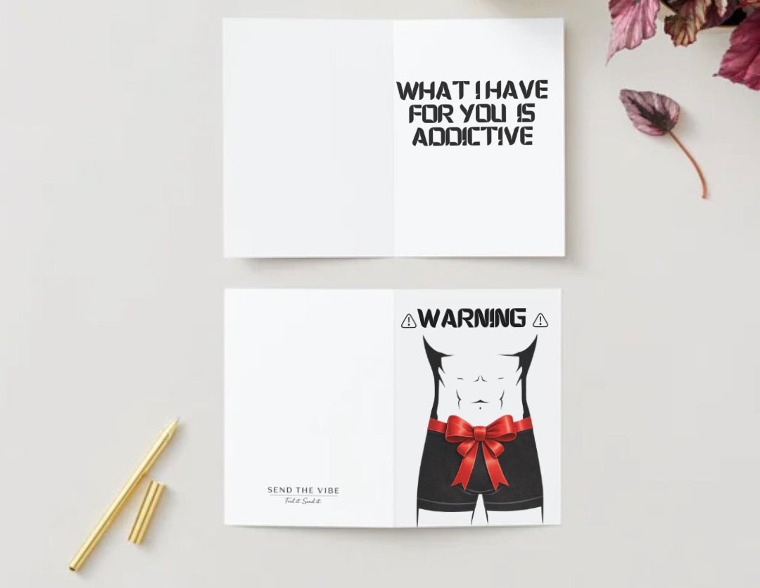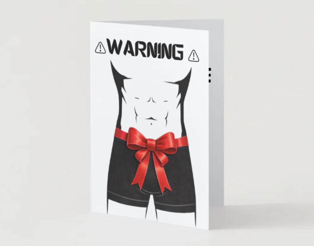 A playful and romantic greeting card designed to add a little fun and flirtation to your special moment. The front features a stylish illustration with a gift-inspired theme, combining bold black, white, and red elements for a clean and eye-catching look. When opened, the inside continues the lighthearted tone with a cheeky message and space to write your own personal note.